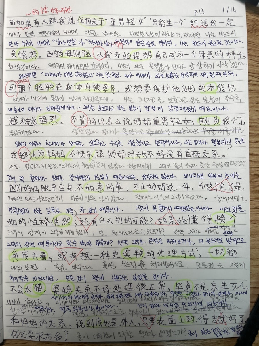 이번 장면은 슈퍼MZ며느리의 속마음이 잘 드러난다. 작가가 90년생 가임기 여성이라 애초에 시어머니와의 관계는 좋을 수 없는게 정상이라고 디폴트 값으로 생각하고 있다. 이부분은 좀 나역시 공감될 지도. 각자 자식의 부모로써 어쩔 수 없는 부분이라고 생각한다. 근데 엄마가 되면 강해지는 마음이 생기나? 근데 딸이 엄마의 성격에 대해 분석하고 있는 장면이 또 나 같다고 느껴졌다. 그러면서 나는 또 반성하고 있다. 엄마도 엄마가 처음이고 처음으로 겪는 일인데 너무 내가 엄마를 엄마답지 못하다고 속으로 나무라는 거 아닌가 싶기도 하고 불효녀인 나는 매번 반성하면서 효도하자고 되뇌긴다. 학교다닐때 매번 선생님이 부모님께 효도해야한다고 반복적으로 알려줄때는 그냥 흘려들었었는데 요즘은(한살씩 나이들면서) 그러려고 노력하고 있다. 나도 잘하는게 없어서 내 행동을 반성하면서 나아지고 싶다. 중국어 공부하다가 갑자기 자아성찰시간;